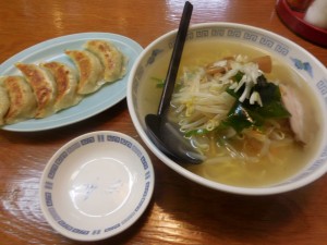 帰りに駅前で塩ラーメンと餃子をいただきました。