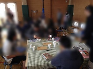 今回はいつもとは違うネタ、構成を用意し、子供たちと紙コップでジャグリングの道具作りにチャレンジ。